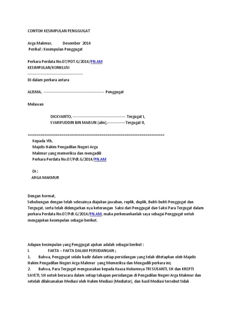 Contoh kesimpulan (tergugat) kesimpulan tergugat ii perkara perdata no. Termohon kasasi sebagai para tergugat asli dimuka persidangan pengadilan. Untuk untuk itu baik penggugat maupun tergugat membuat kesimpulan atau diberi kesempatan oleh hakim untuk mengajukan kesimpulan yang diserahkan kepada . Kesimpulan tergugat atas replik penggugat dalam. Penggugat mengajukan gugatan ke ptun karena merasa kepentingannya.